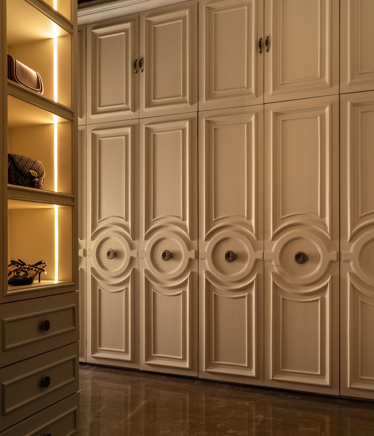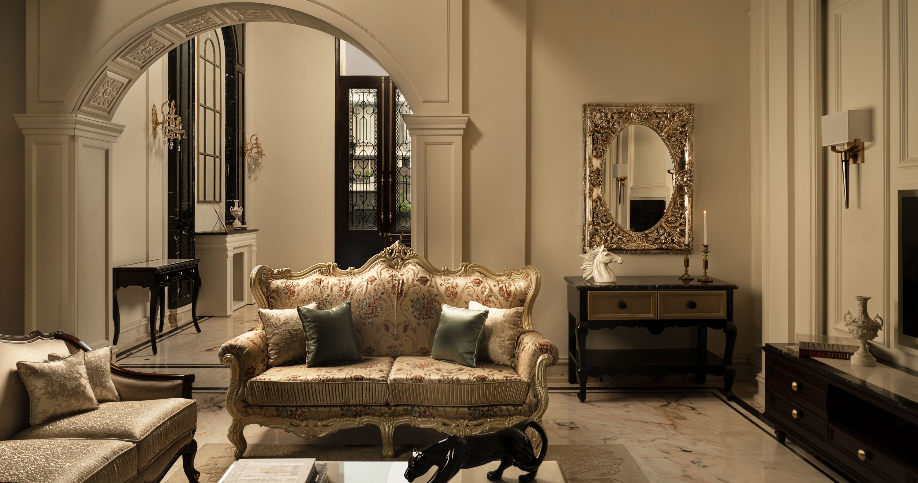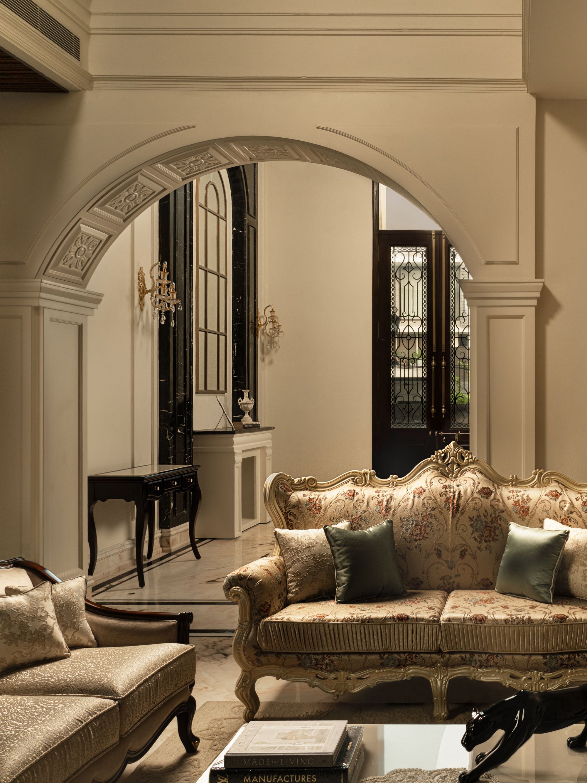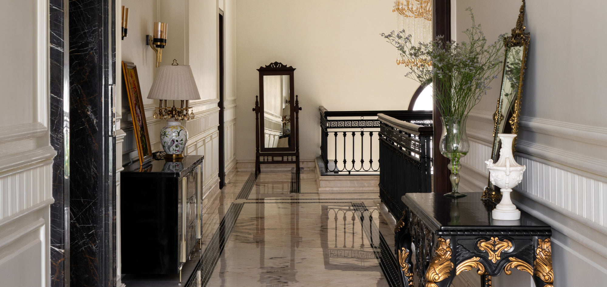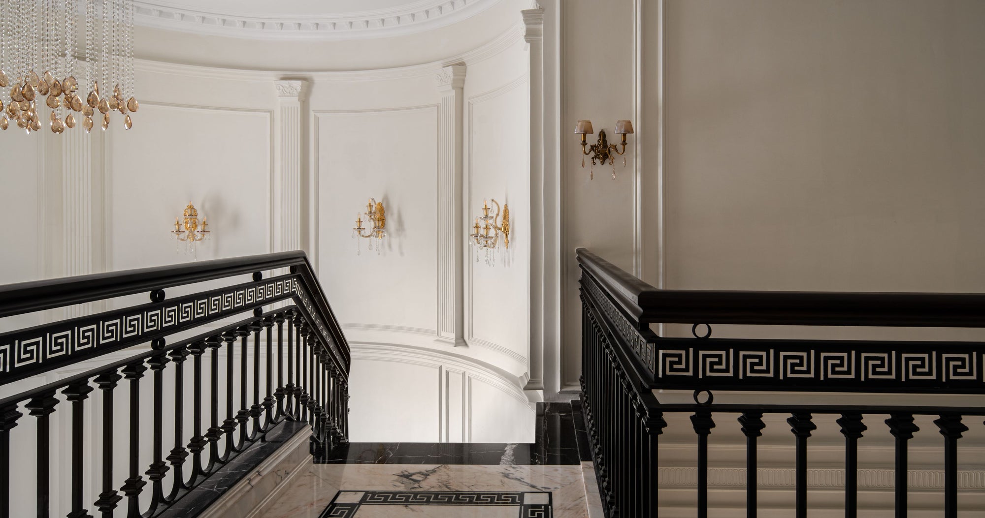 The design language embraces intricate stonework and detailed frescoes, showcasing a dedication to artisanal excellence. Finishes in soft whites and delicate hues elevate the interiors, allowing the elaborate detailing to stand out while preserving a sense of tranquility. This balance creates a space that feels luxurious yet refined, steeped in classical references while remaining relevant in a contemporary context.