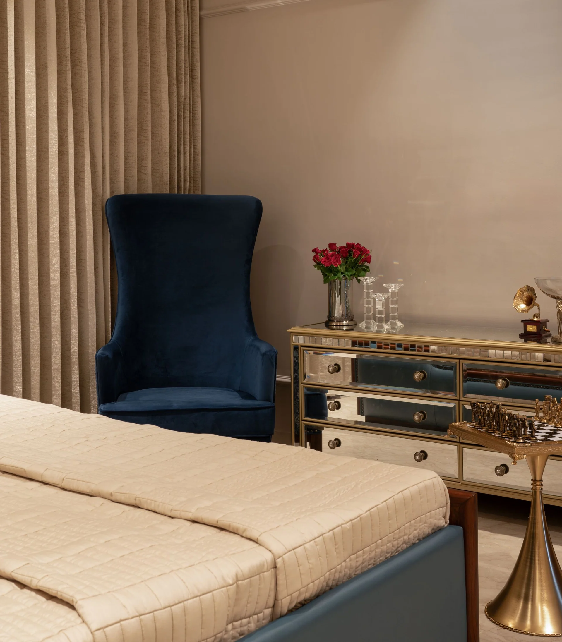 The interiors feature dramatic colorscapes, particularly in the washrooms, where bold hues seamlessly integrate with a tropical classicism aesthetic. Throughout the residence, muted opulence defines the space, balancing understated luxury with timeless elegance.