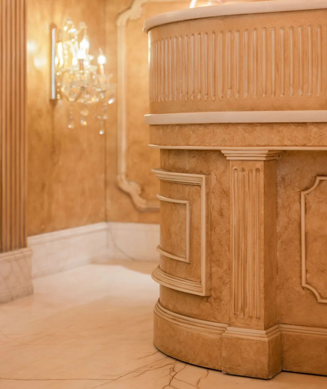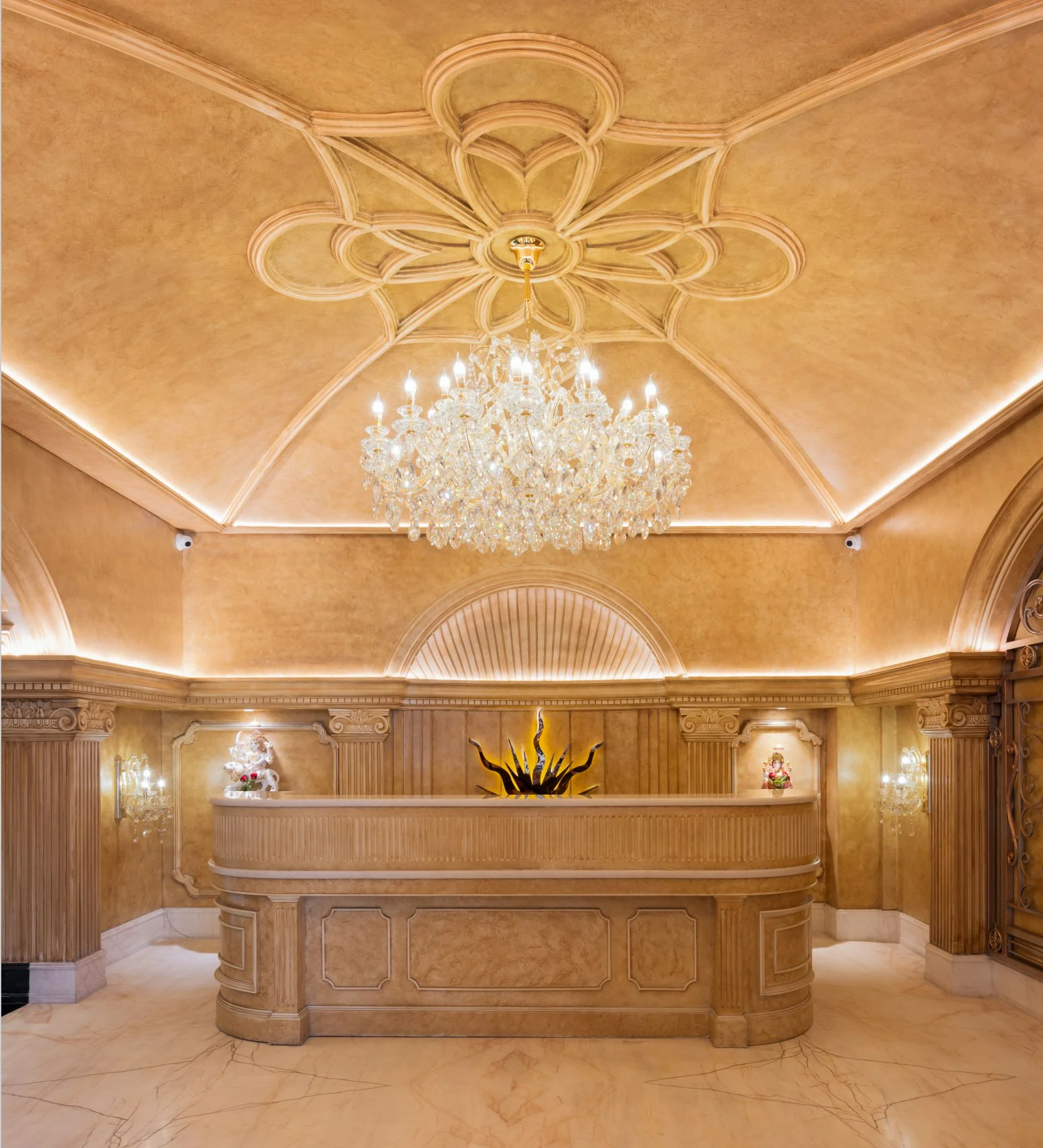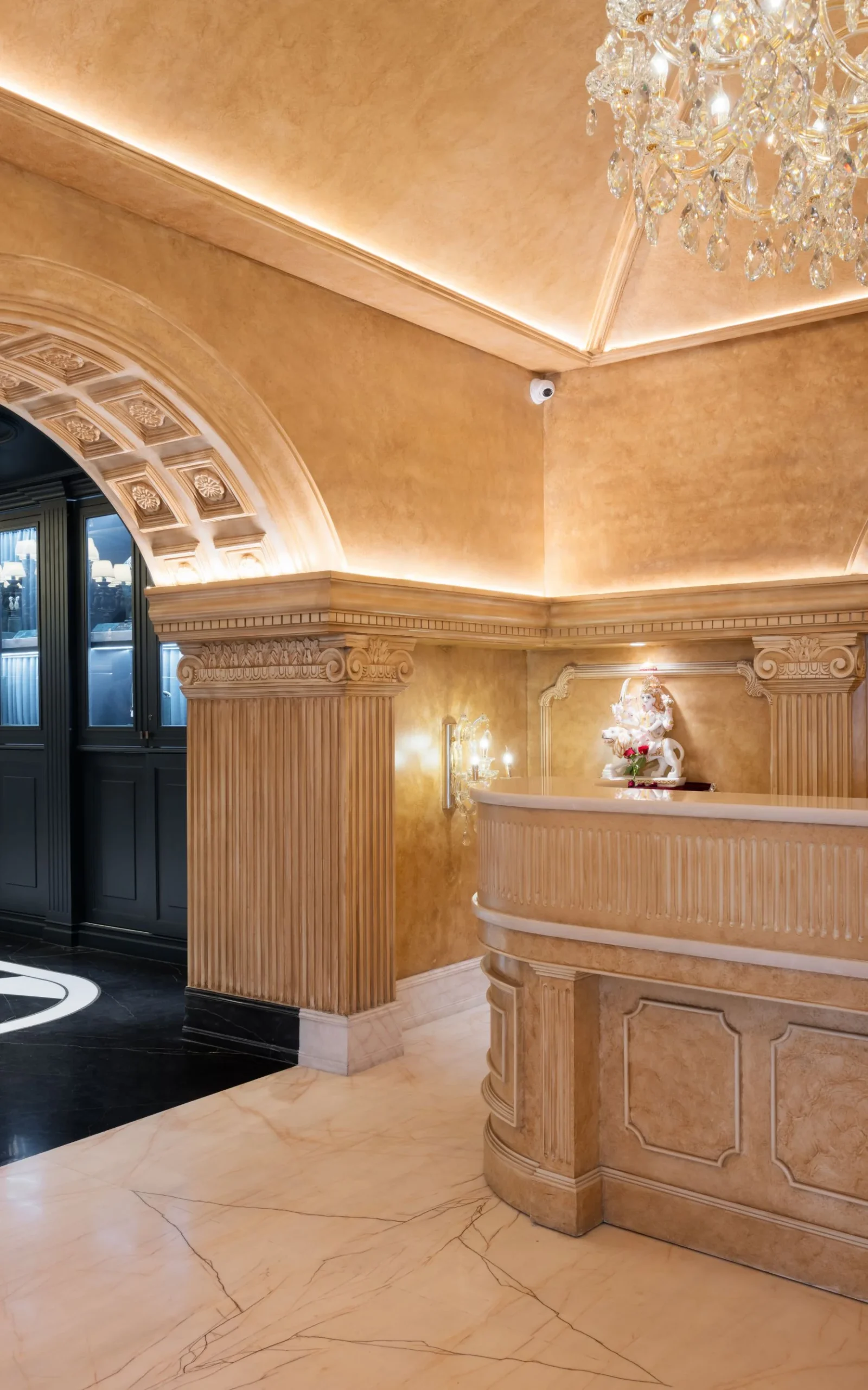 The design of this luxury jewellery showroom exudes boldness and sophistication, creating an impactful first impression. The rich black and gold color palette sets the stage for a sense of opulence, with white marble tables that complement the vintage chairs, adding a touch of timeless elegance.