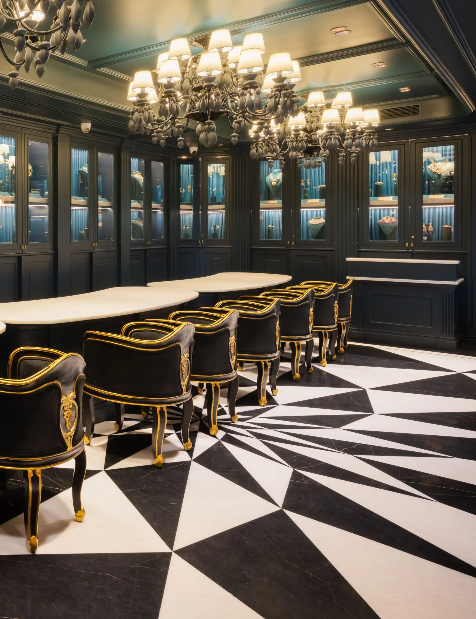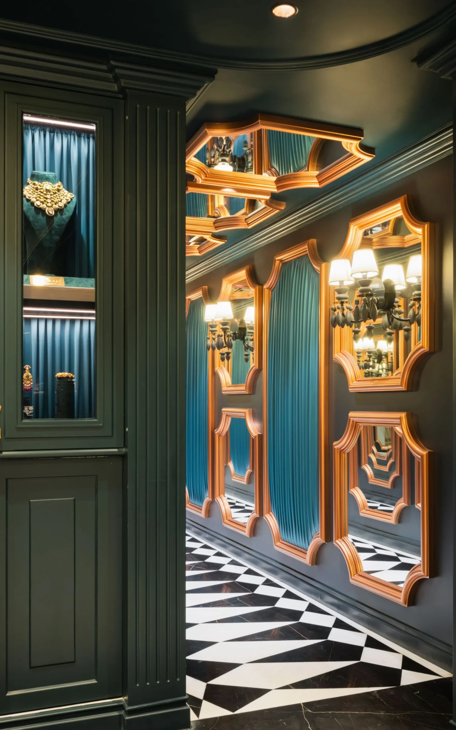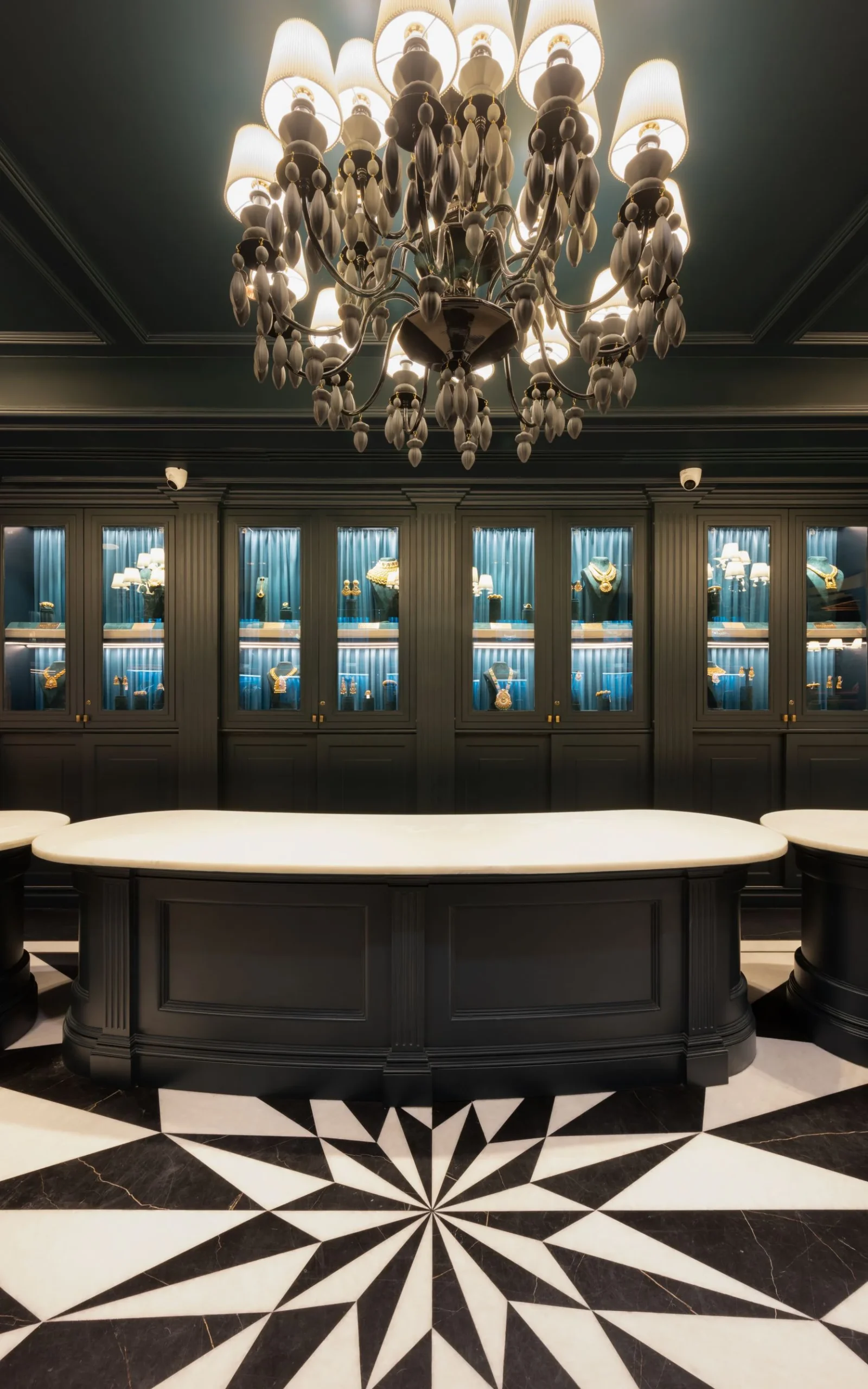 Glass cabinets display the exquisite jewellery collection against dark panels, while chandeliers cast a soft glow, enhancing the refined atmosphere. A playful checkered floor adds a surprising twist, and intricate detailing elevates the space.