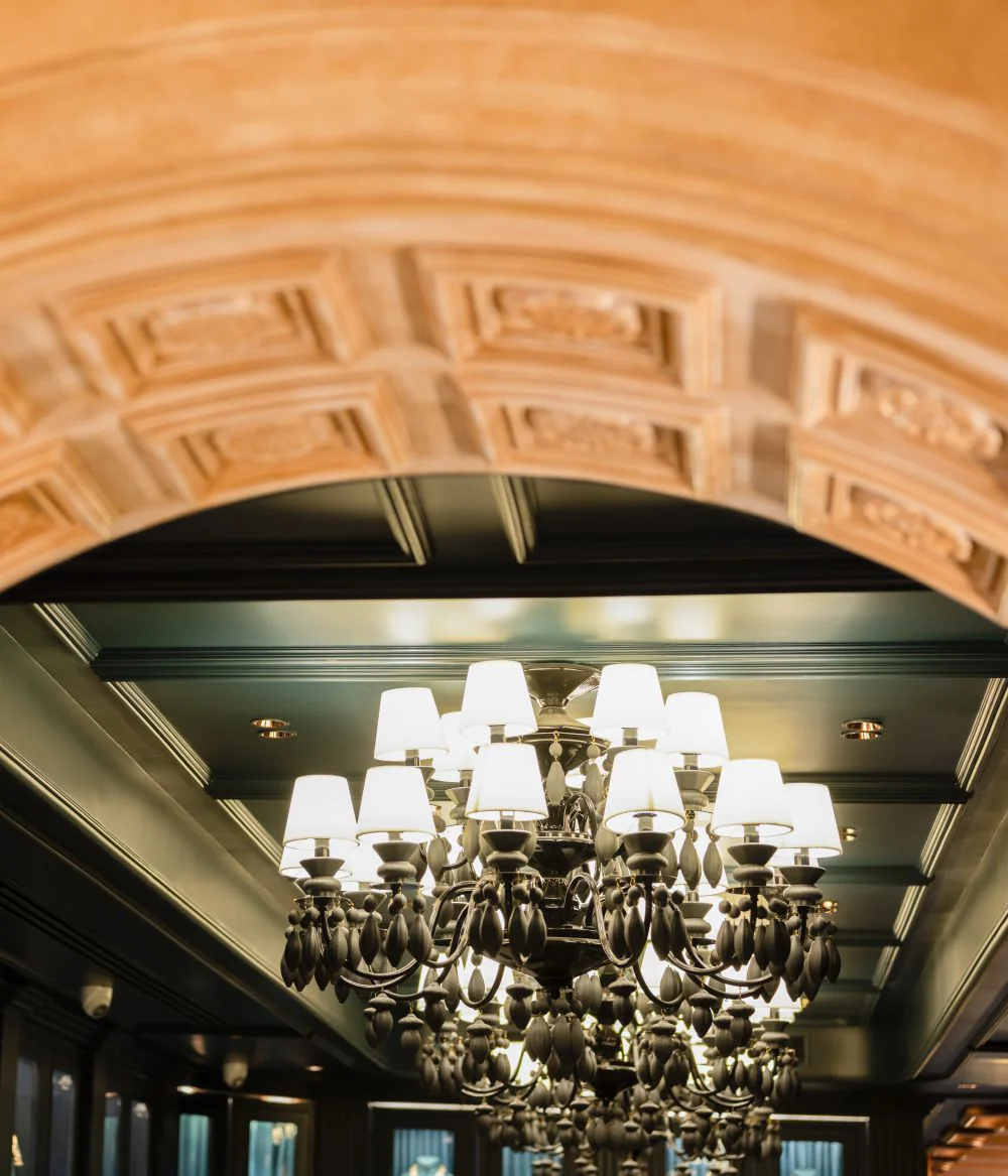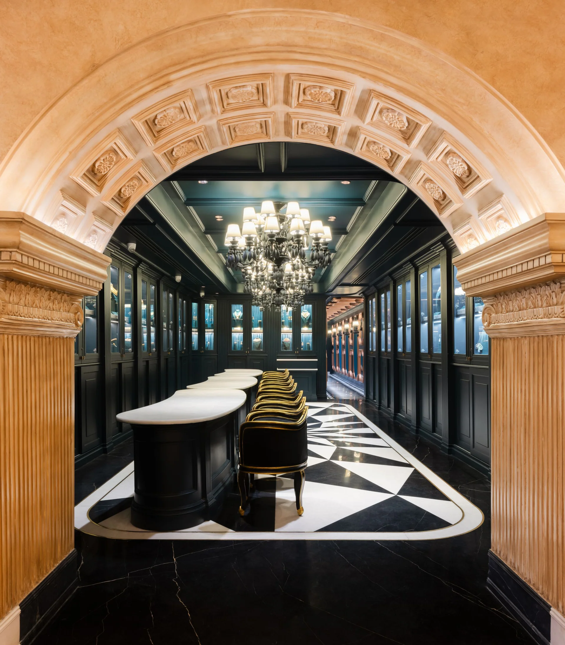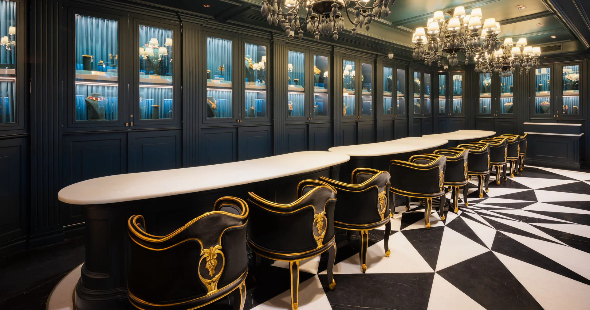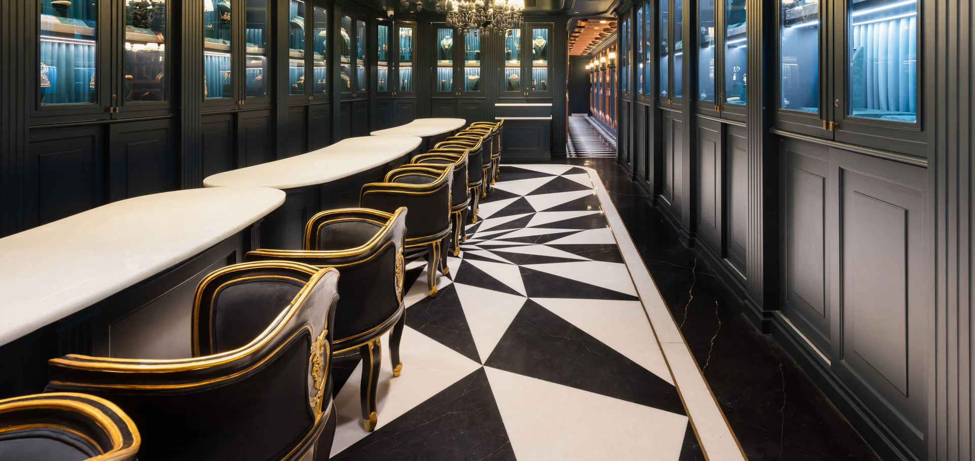 Glass cabinets display the exquisite jewellery collection against dark panels, while chandeliers cast a soft glow, enhancing the refined atmosphere. A playful checkered floor adds a surprising twist, and intricate detailing elevates the space.