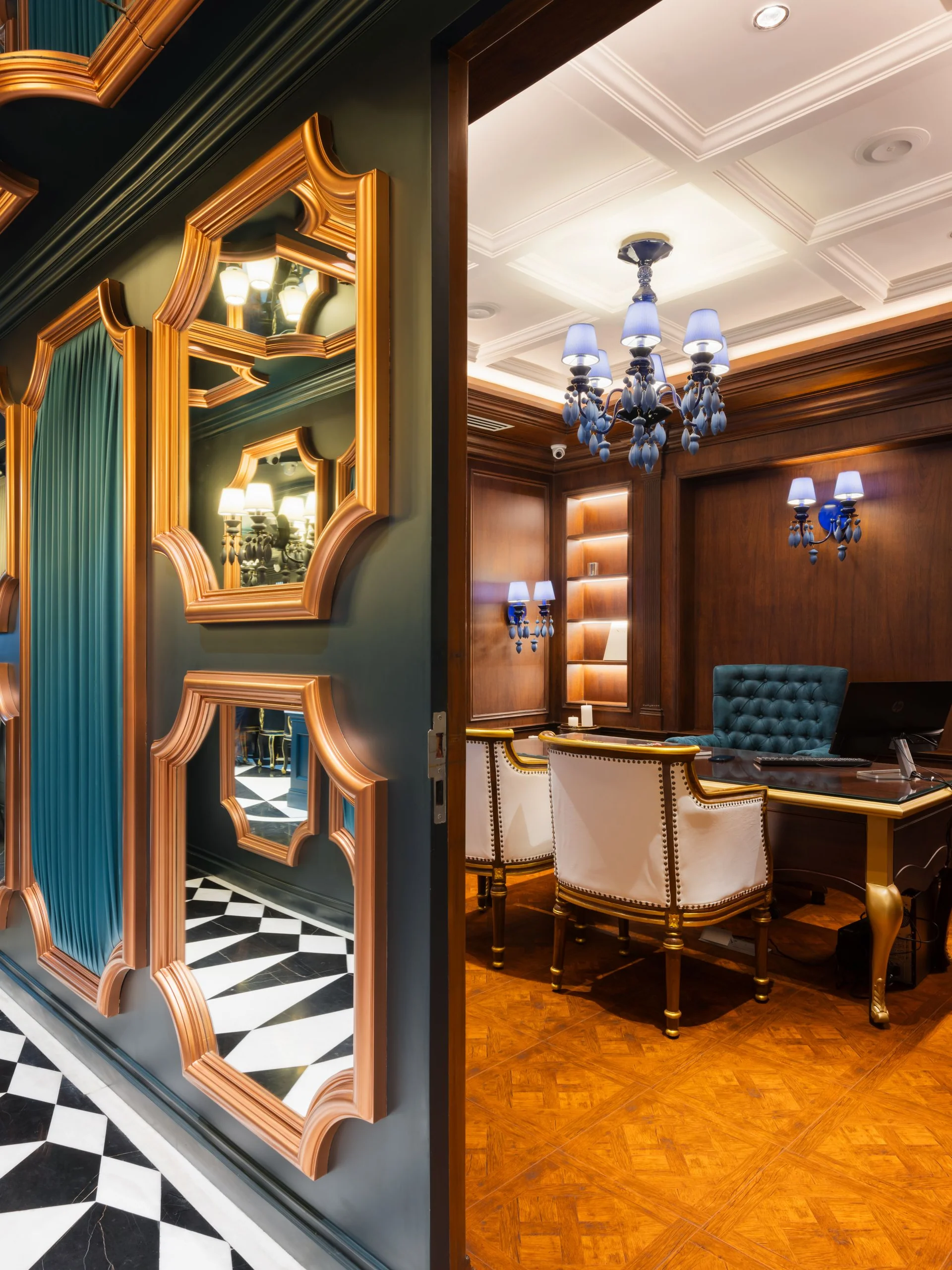 Against a backdrop of dark panels, glass cabinets showcase the exquisite jewellery collection, each piece highlighted to perfection. The chandeliers hanging from the ceiling cast a soft, inviting glow, enhancing the showroom’s refined atmosphere, while the playful checkered floor adds a surprising twist to the space. Intricate detailing throughout the showroom weaves a luxurious narrative, elevating the design to a new level of elegance. In this haven of refinement, time seems to slow down, inviting guests to savor each moment, much like the gems and intricate designs that define MALLIRAM’s unparalleled collection. Every element within the space is thoughtfully crafted to mirror the beauty and craftsmanship of the jewellery on display, making it an unforgettable experience.