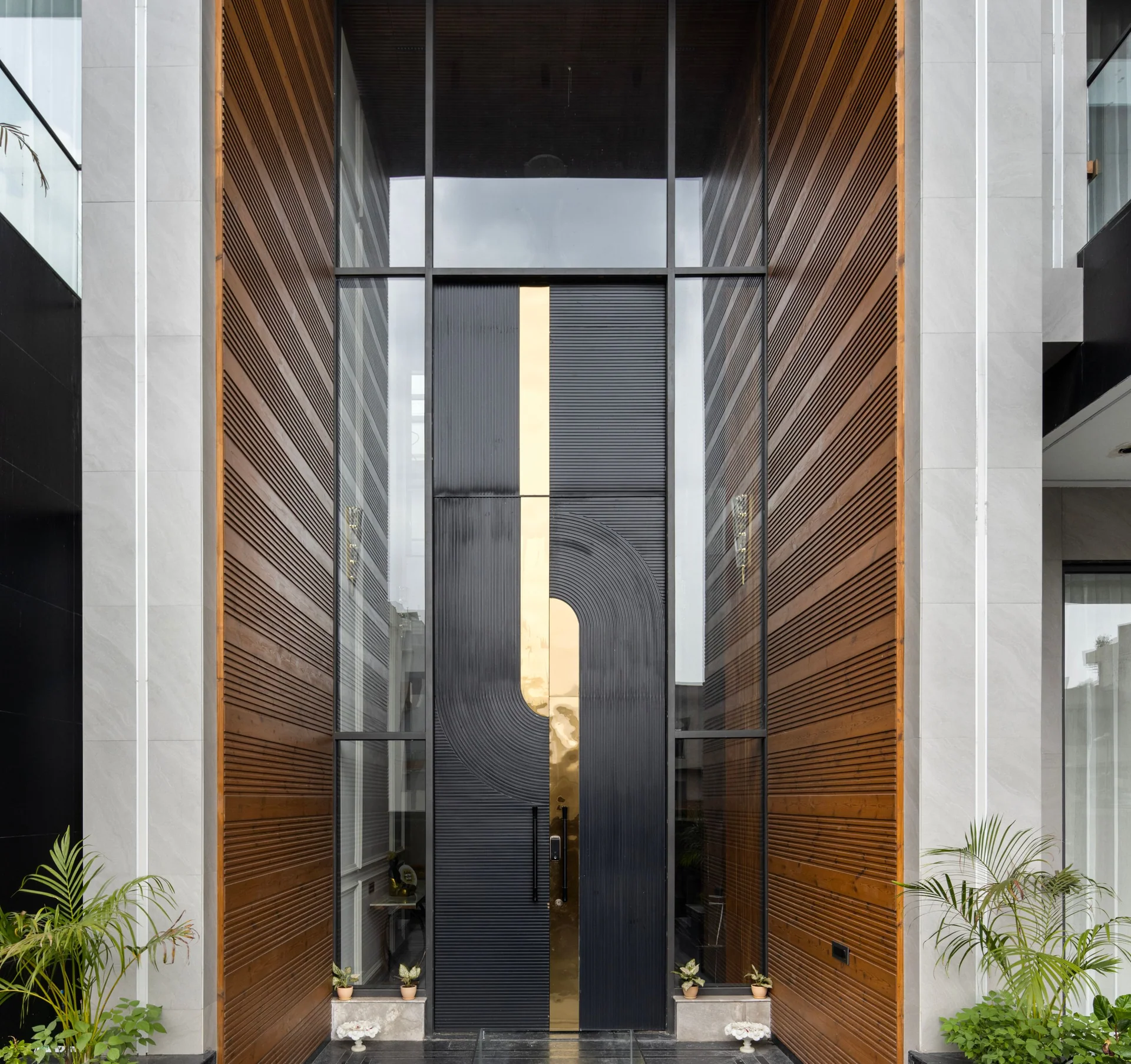 The architecture of Modesco is defined by a striking balance of bold geometric forms and refined materiality. Expansive glass facades flood the interiors with natural light, complemented by wooden accents and sleek metal detailing that emphasize openness. Inside, high ceilings, plush furnishings, and a neutral palette accented by statement lighting and textured surfaces create an elegant atmosphere