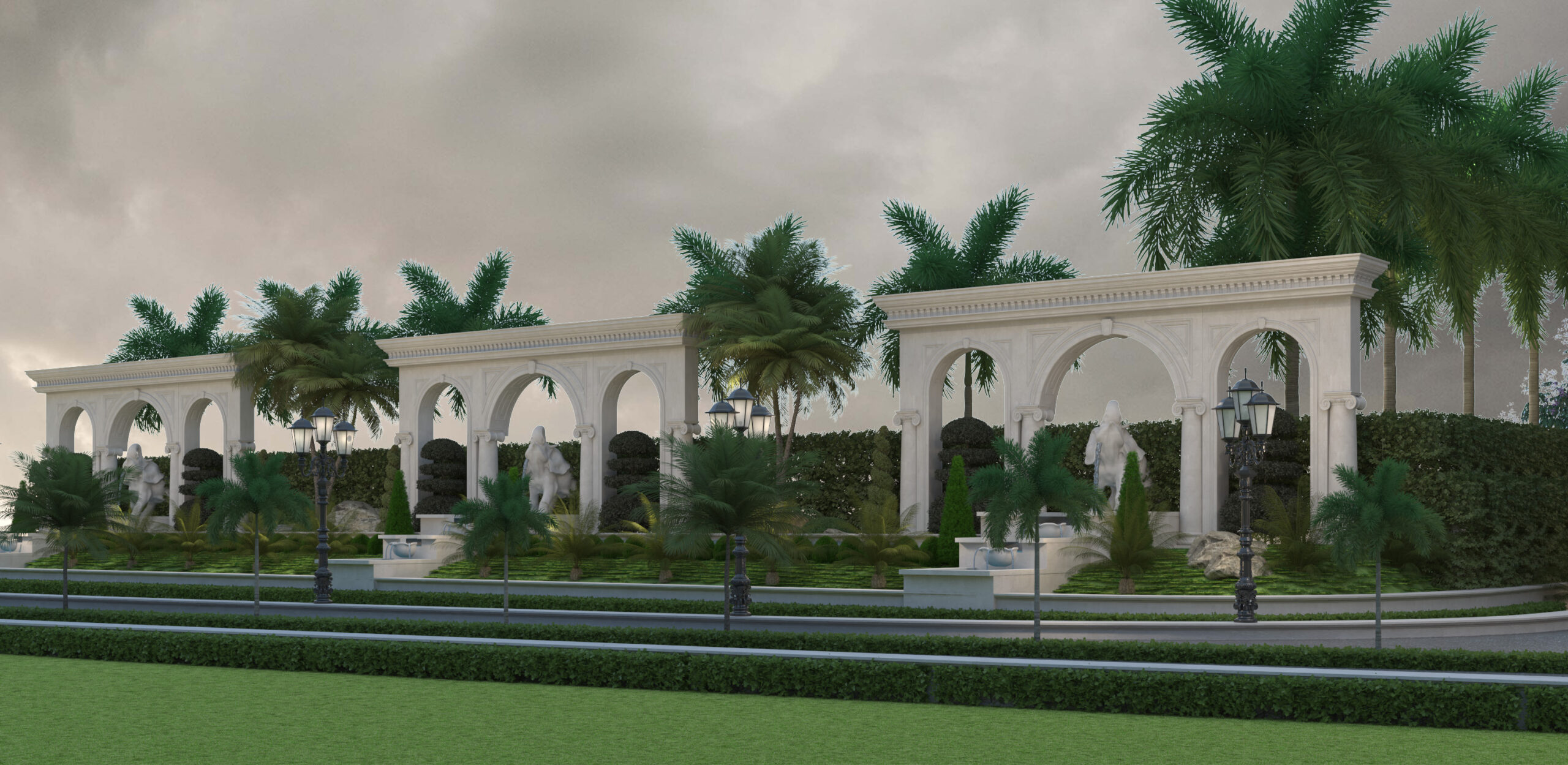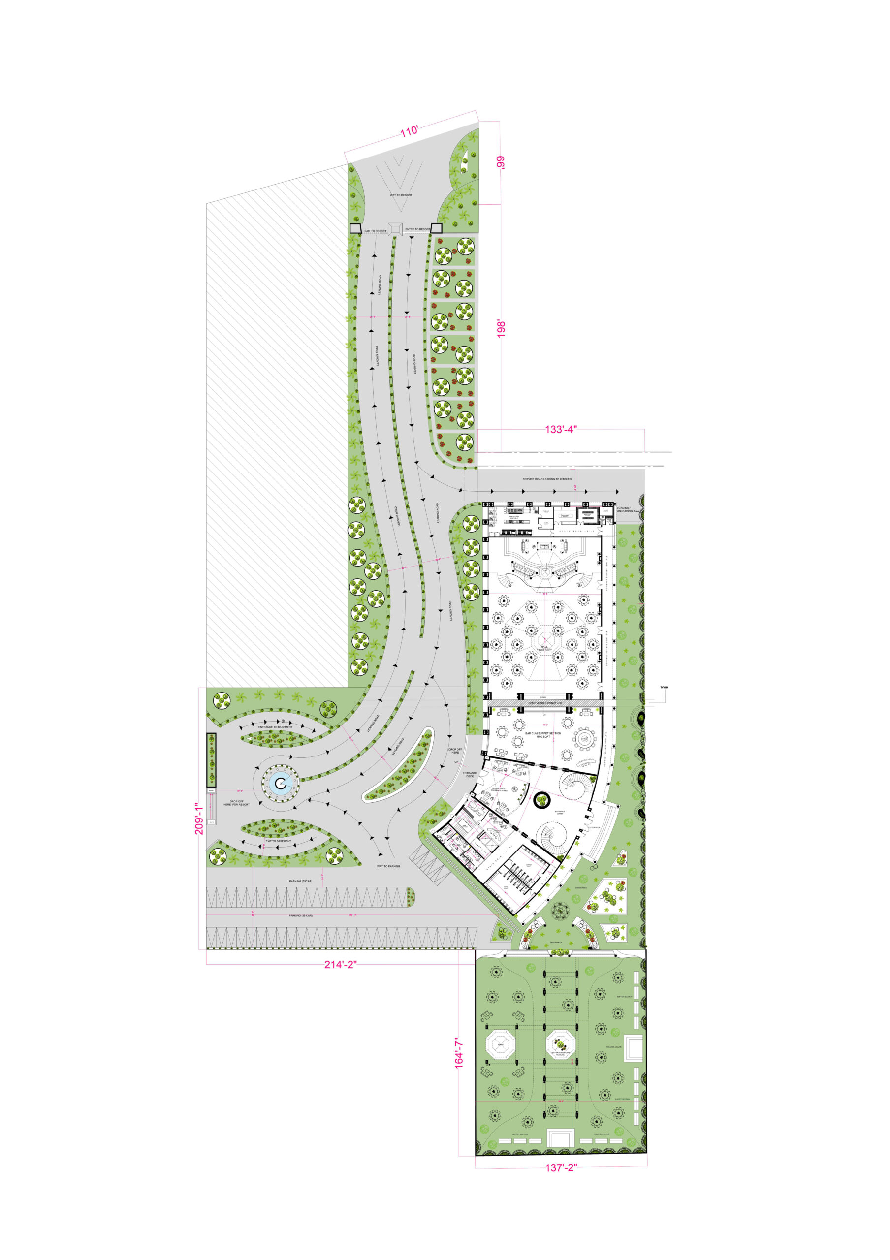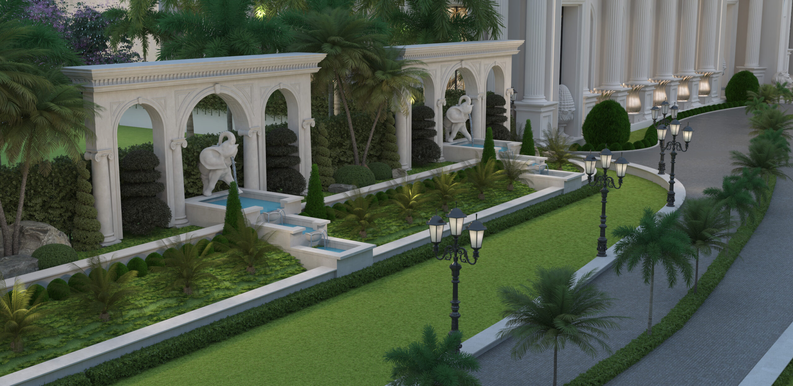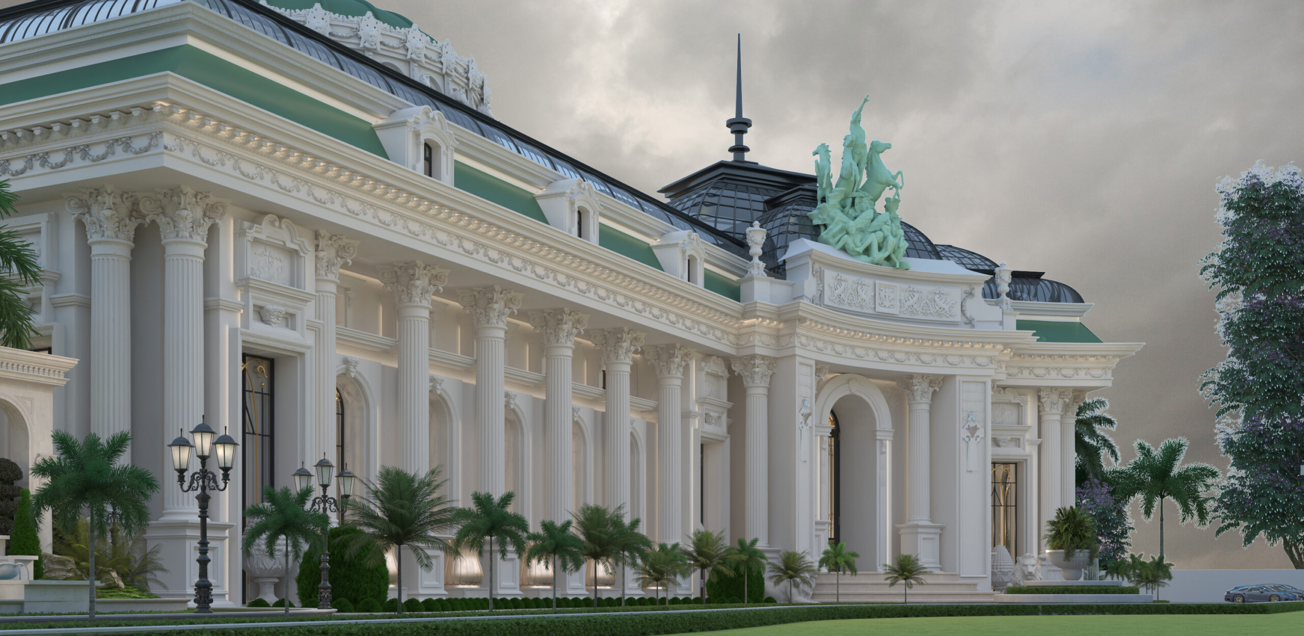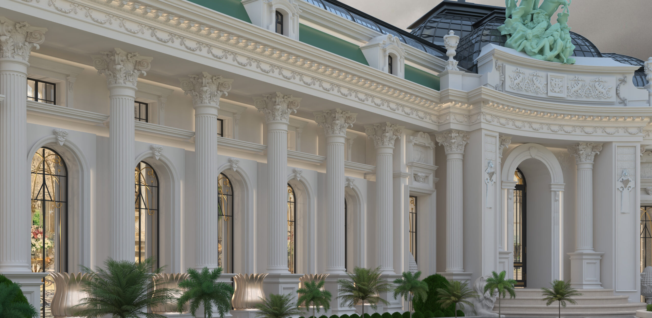 At the heart of the design lies a large glass pavilion, creating a luminous central space that serves as the visual and functional centerpiece of the resort. This pavilion not only connects various wings but also introduces a contemporary touch that balances the traditional neoclassical vocabulary. The main entrance, framed by towering columns, welcomes guests into a world where luxury meets timeless architectural elegance.