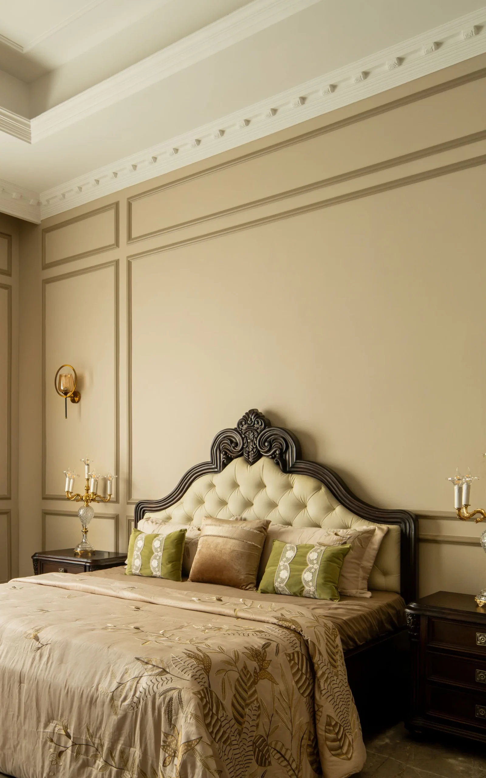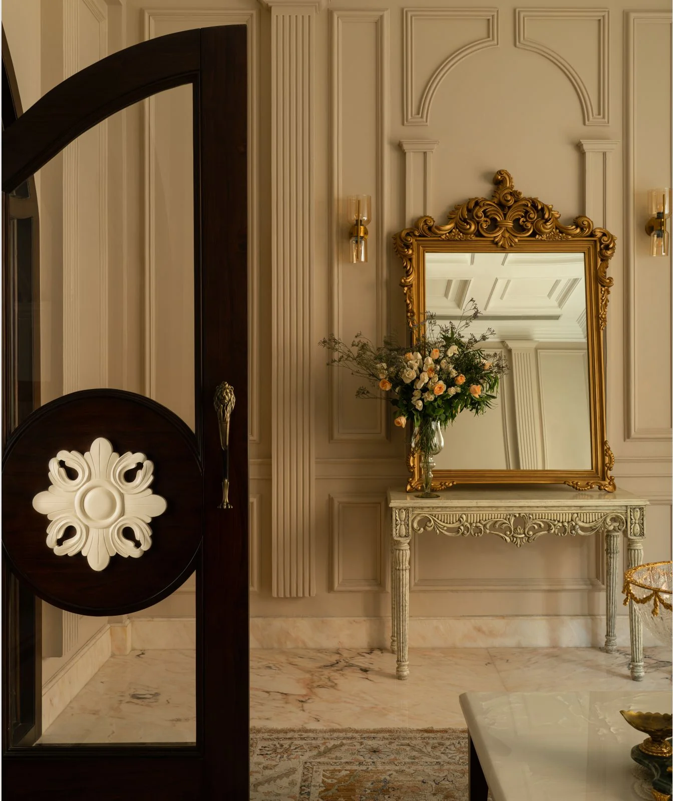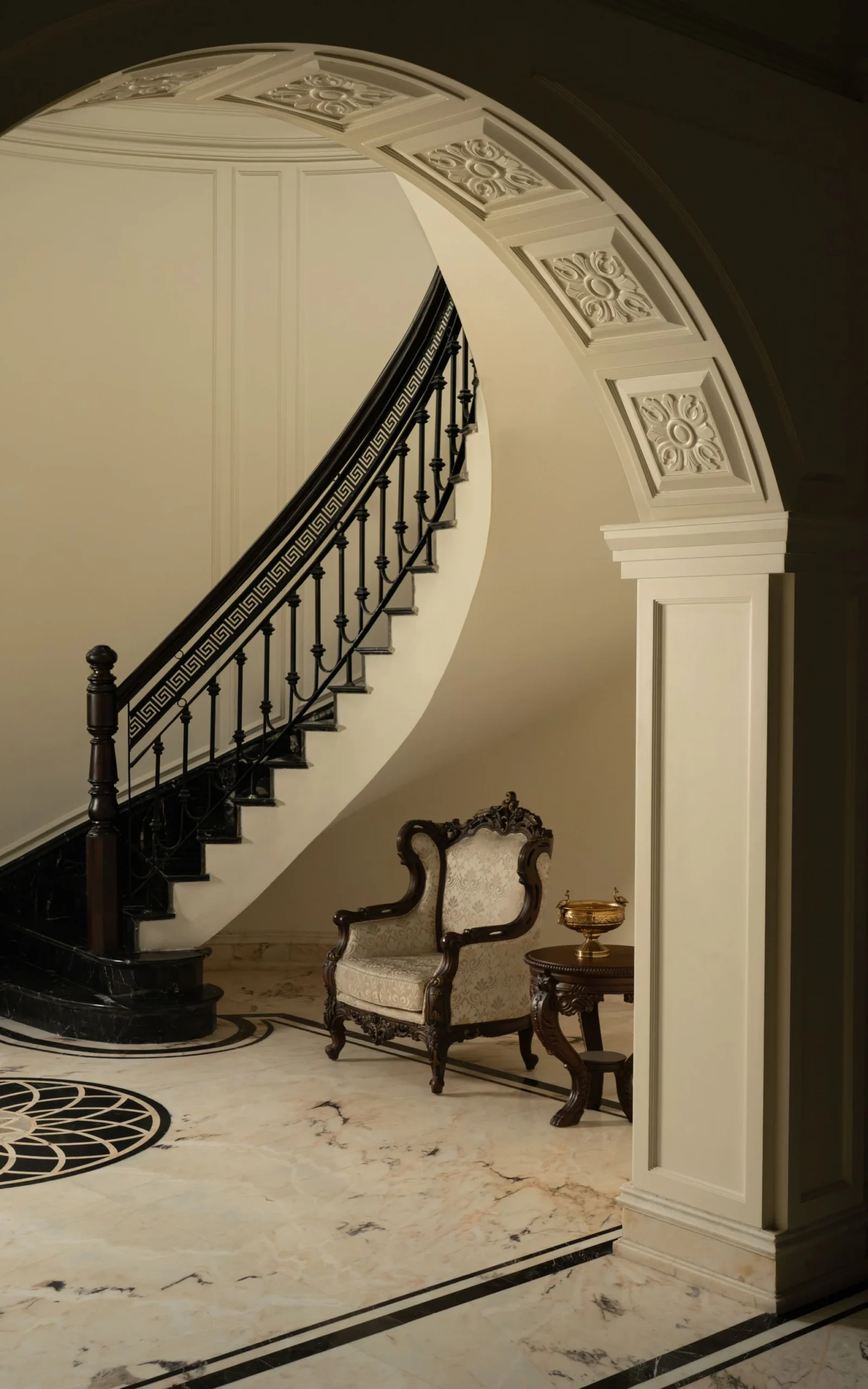 The design language embraces intricate stonework and detailed frescoes, showcasing a dedication to artisanal excellence. Finishes in soft whites and delicate hues elevate the interiors, allowing the elaborate detailing to stand out while preserving a sense of tranquility. This balance creates a space that feels luxurious yet refined, steeped in classical references while remaining relevant in a contemporary context.