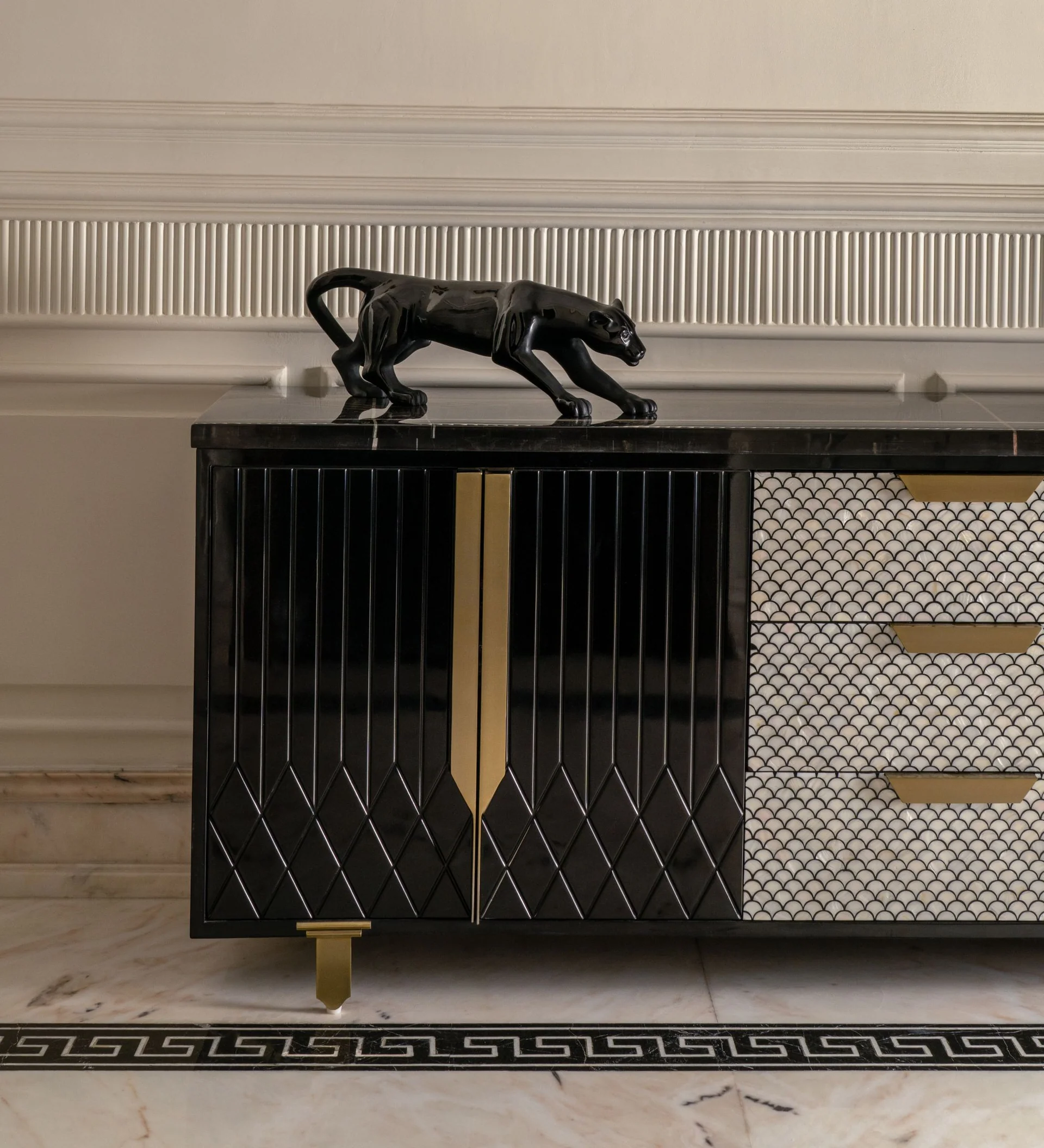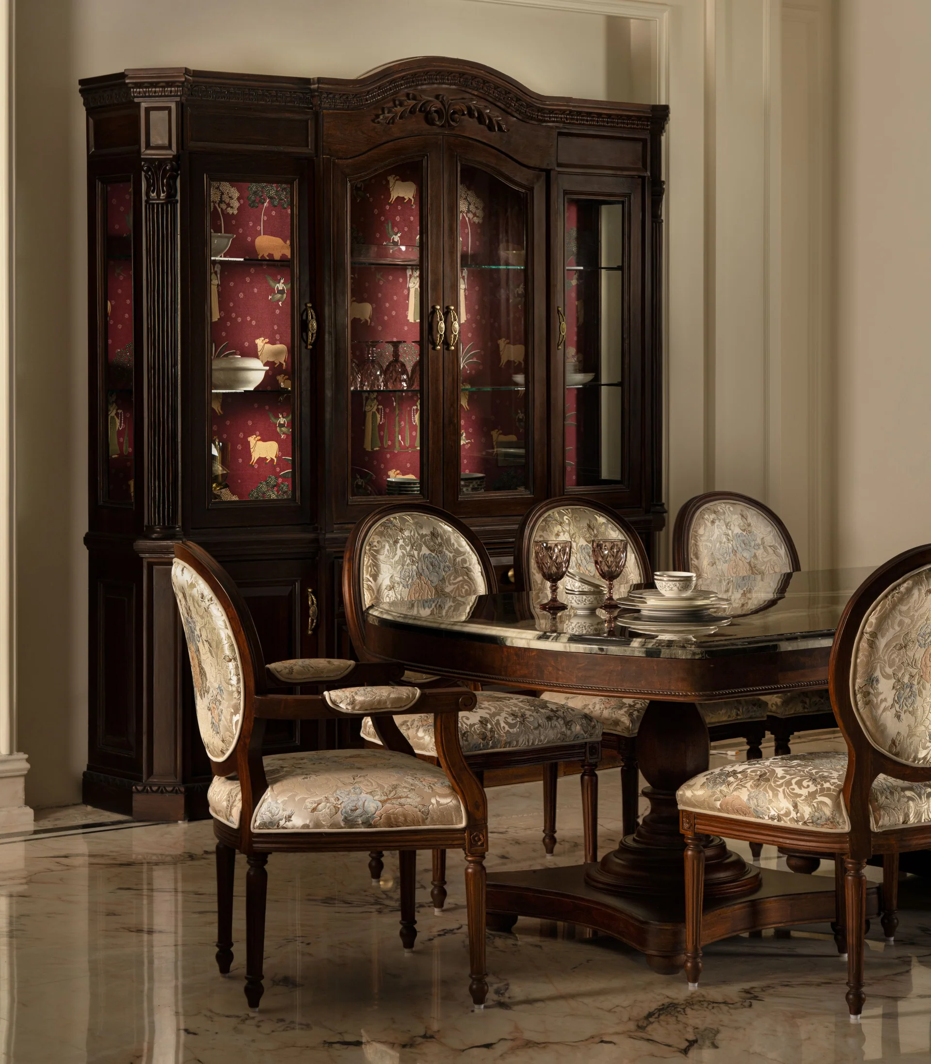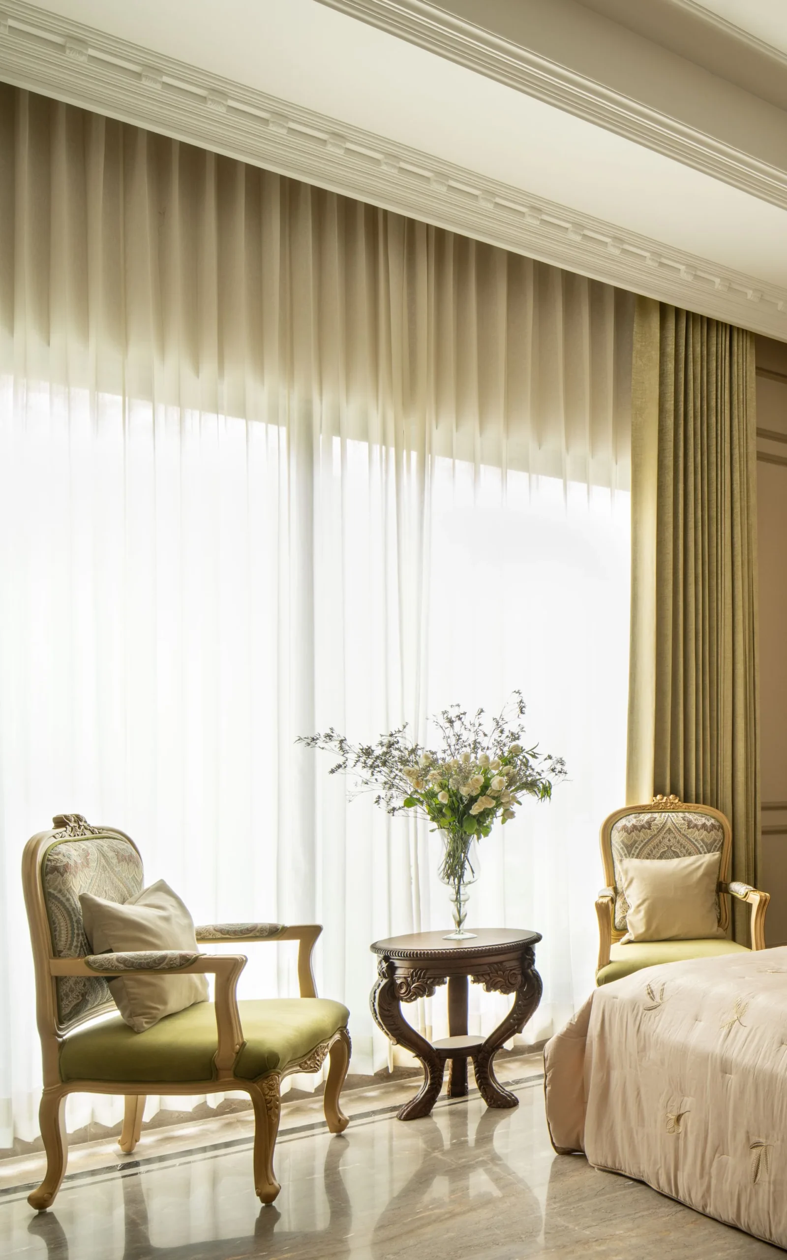 The design language embraces intricate stonework and detailed frescoes, showcasing a dedication to artisanal excellence. Finishes in soft whites and delicate hues elevate the interiors, allowing the elaborate detailing to stand out while preserving a sense of tranquility. This balance creates a space that feels luxurious yet refined, steeped in classical references while remaining relevant in a contemporary context.